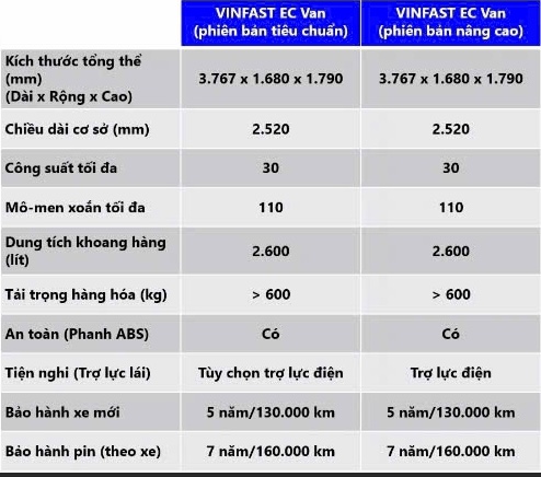 So sánh Vinfast EC VAN bản tiêu chuẩn và bản nâng cao