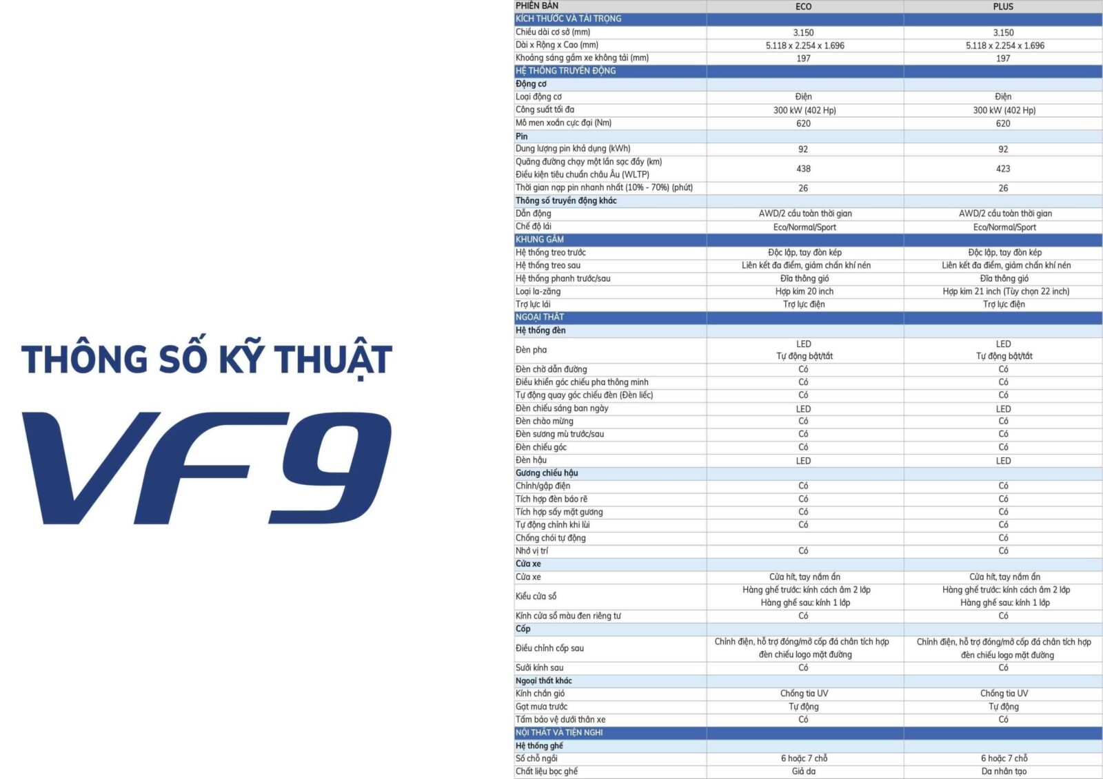Dù có ngoại hình bề thế nhưng theo công bố từ hãng xe Việt, VinFast VF 9 chỉ mất 6.5 giây để tăng tốc từ 0-100km/h. Xe có 2 tùy chọn pin khác nhau, bản tiêu chuẩn sẽ có phạm vi hoạt động 485 km còn bản Plus có thể di chuyển quãng đường 680 km sau mỗi lần sạc đầy.