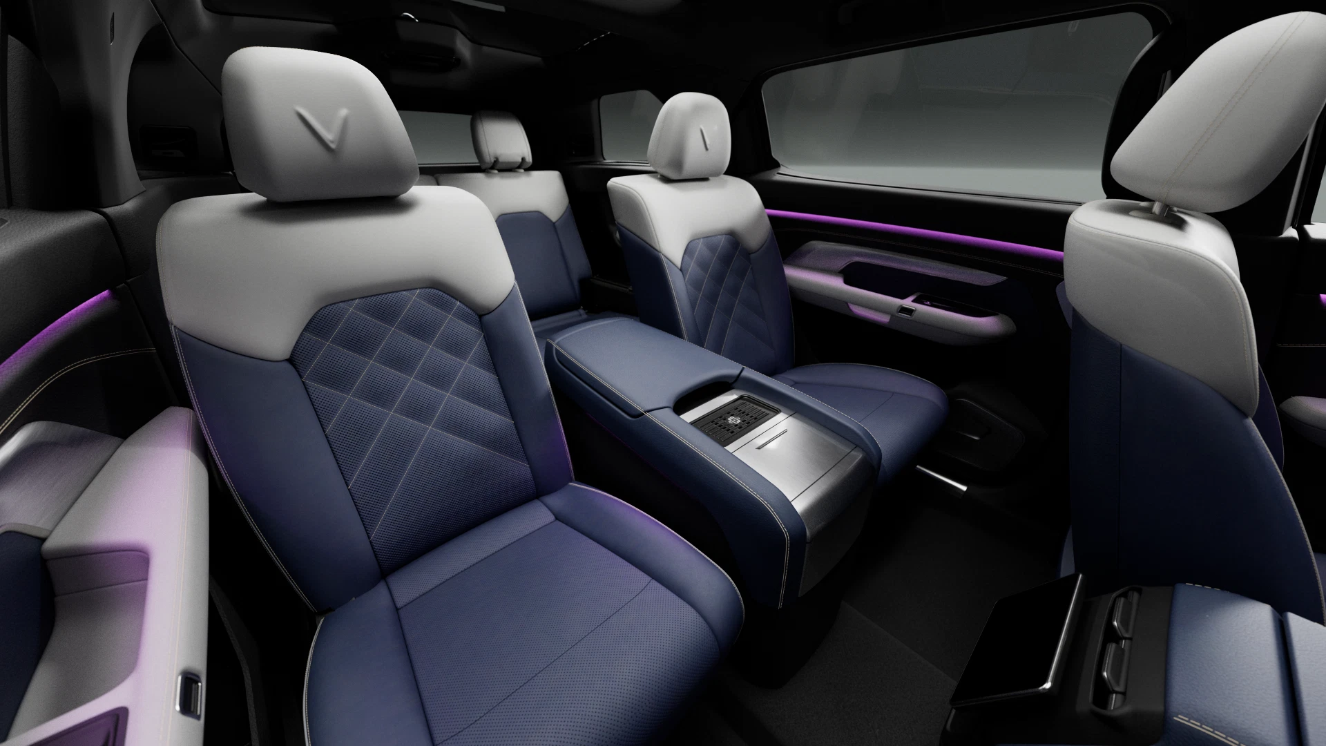Khoang nội thất VinFast VF9 thiết kế theo hướng tối giản nhưng sang trọng và tiện dụng với loạt vật liệu cao cấp. Hệ thống đèn viền với nhiều tùy chọn màu sắc là một trong các chi tiết tạo nên điểm ấn tượng cho không gian bên trong VF9.